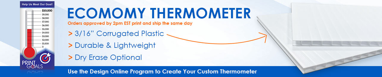 Customize your goal thermometer online by clicking on one of the products below. When using a big thermometer for fundraising, you can give your organization a visual aid to show how far you have left to go to hit the big goal. Getting closer to your goal can help inspire donators to push that last little bit. If you're using a customer goal thermometer internally to help generate company goals, then it can have the same effect. Motivating employees by providing a printed visual aid.