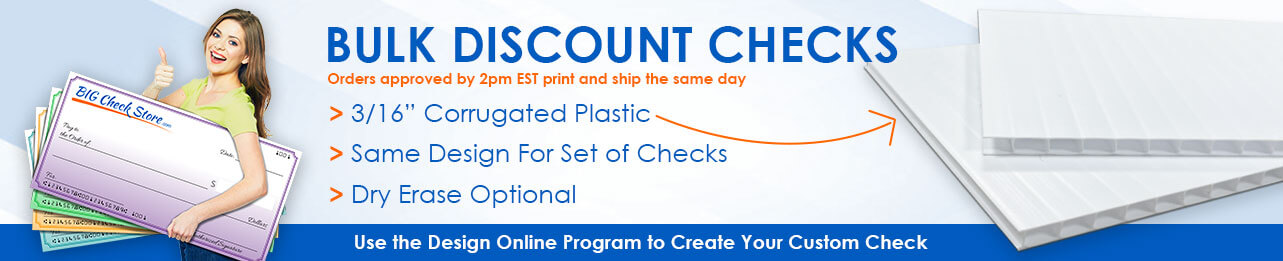 These bulk check sets are great if you need to do a lot of check presentations.  The price includes full color printing of the same design for the set.  You can hand write in the pertinent information with a marker for each check presentation or add the info in the design online program to be printed.