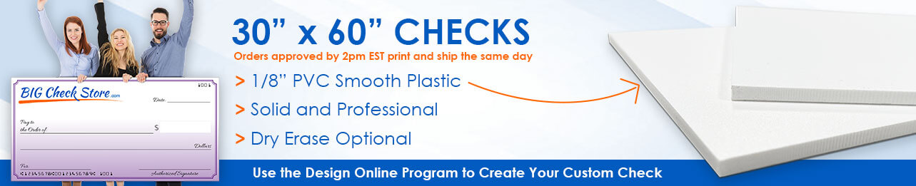 PVC checks are printed on a 1/8" smooth plastic board. This is the most professional-looking material which will make a lasting impression when presenting. Unlikely to dent easily, PVC is solid material option that is durable and rigid. Like the Economy material, PVC can be written on with permanent marker for one use or a dry erase marker for multiple (dry erase lamination option required).