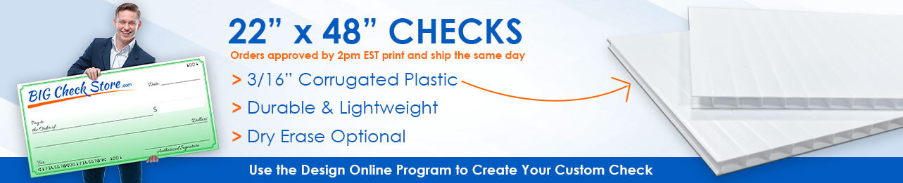Economy checks are printed on a 4mm (about 3/16" thick) corrugated plastic board, also known as Coroplast®. This is the most popular material chosen for novelty checks because it's low-cost yet still durable and rigid. It is waterproof and lightweight, but if dropped, corrugated plastic does not crack. Because it's corrugated, there are slight ridges on the surface but they don't interfere with writing or printing. Economy board checks can be created for a one-time event, whether it's kept by the recipient or hung up on a wall, or for multiple uses. In this case, the optional dry erase upgrade would be required. The dry erase lamination is compatible with dry erase or liquid chalk markers.