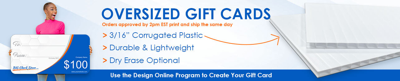 Oversized gift cards are a special and unique way to present a gift to a relative, coworker, employee, friend or loved one. The gift cards are printed on 3/16” corrugated plastic, same as our economy checks but with rounded corners. Customize the cards by choosing a size and background, filling out the fields and uploading a logo (if desired). Optional dry erase lamination is available for multiple uses.